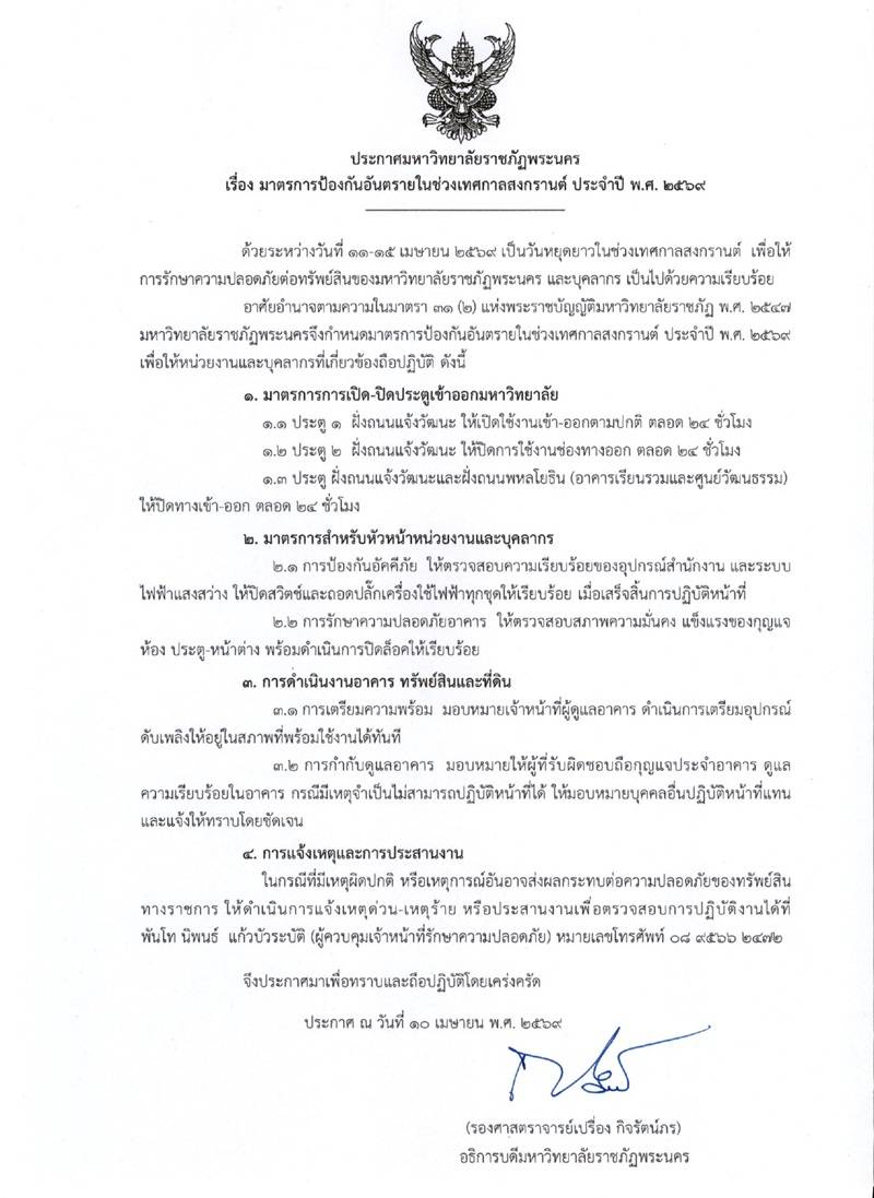 ประกาศมหาวิทยาลัยราชภัฏพระนคร เรื่อง มาตรการป้องกันอันตรายในช่วงเทศกาลสงกรานต์ ประจำปี พ.ศ. 2569